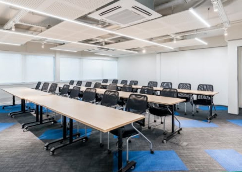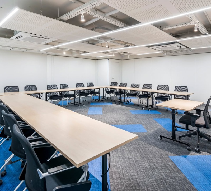 Salas com disposição flexível de mesas e cadeiras, ideais para treinamentos, workshops, palestras e reuniões corporativas. Adapte o espaço ao seu propósito.